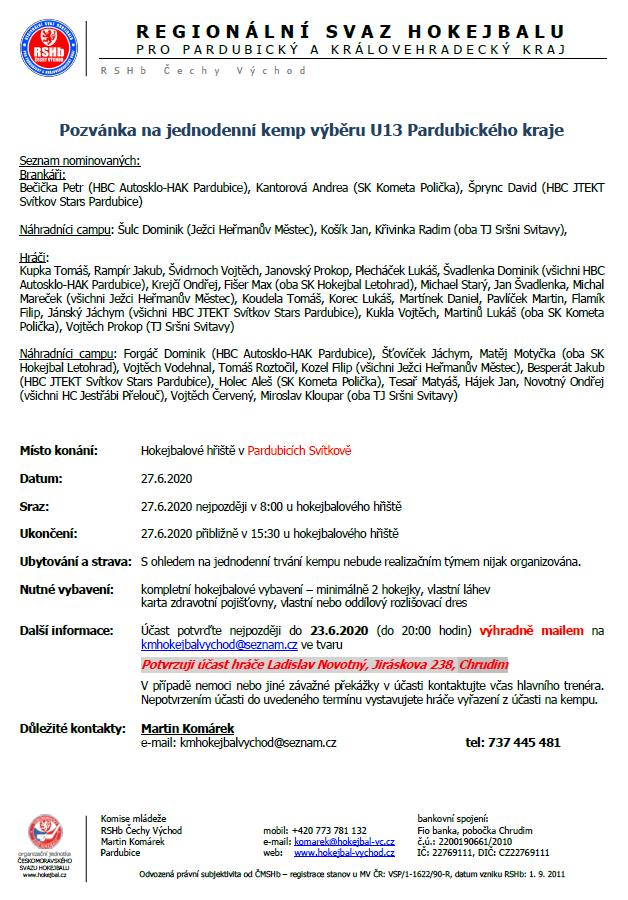Jednodenní kemp výběru hráčů U13 Pardubického kraje (Svítkov):