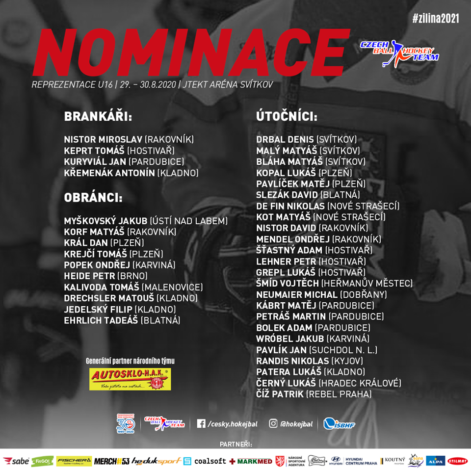 Dvoudenní kemp reprezentačního výběru U16 (29-30.8.2020, hokejbalové hřiště ve Svítkově): Nominace: Kábrt Matěj, Kuryviál Jan, Petráš Martin, Bolek Adam