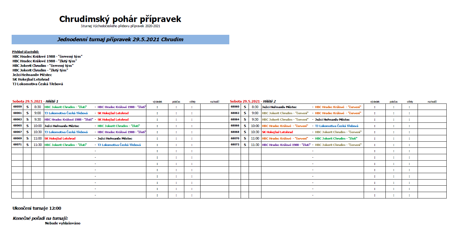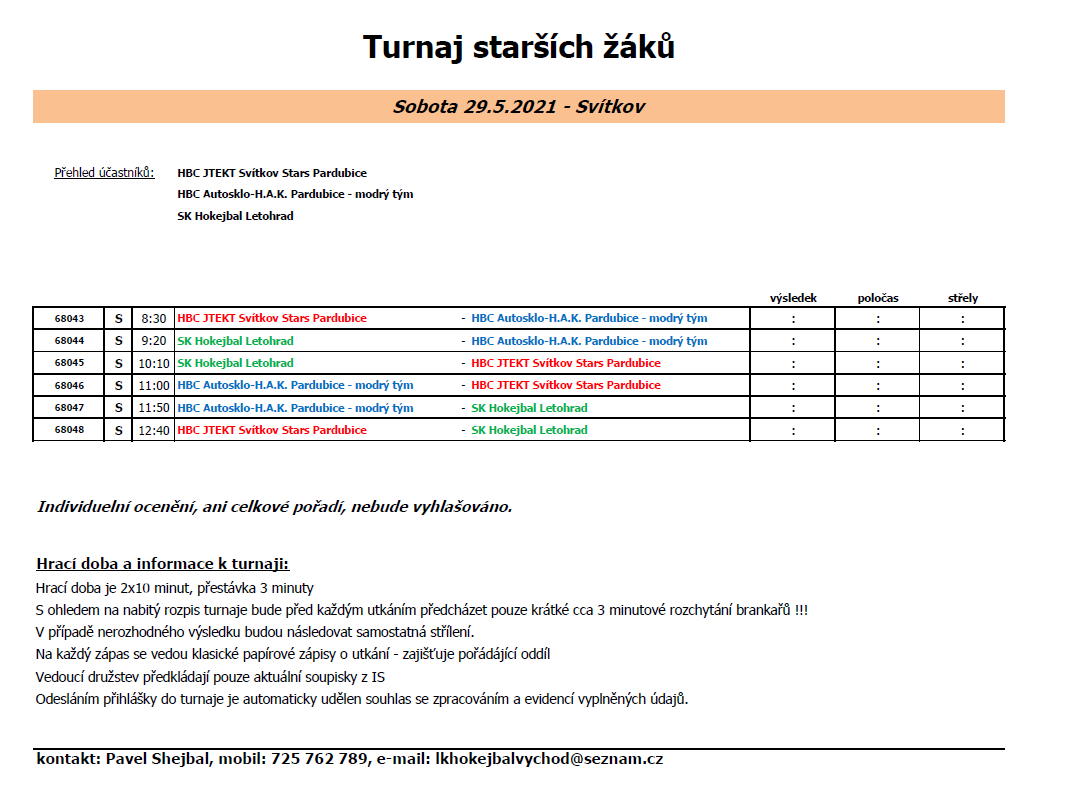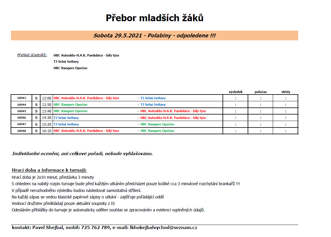 Turnaj – modrý: HBC Autosklo-HAK Pce „modrý tým“, HBC JTEKT Svítkov Stars Pce „bílý tým“, HBC Tygři Mladá Boleslav „černý tým“, HBC Rangers Opočno